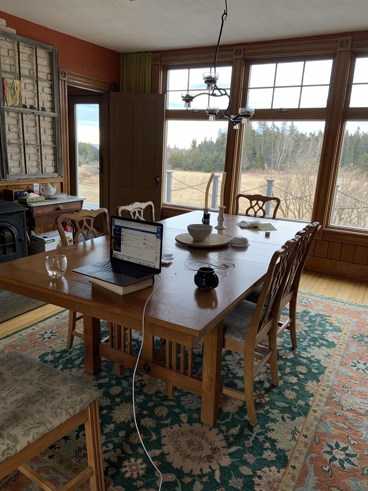 During my writing retreat, I did the same thing. Hopped about the house looking for THAT spot. I found it in the spot you've chosen in the photo. The dining room is my favorite room in the house, and that spot has my favorite view. (Also, the wood stove was right there!!)